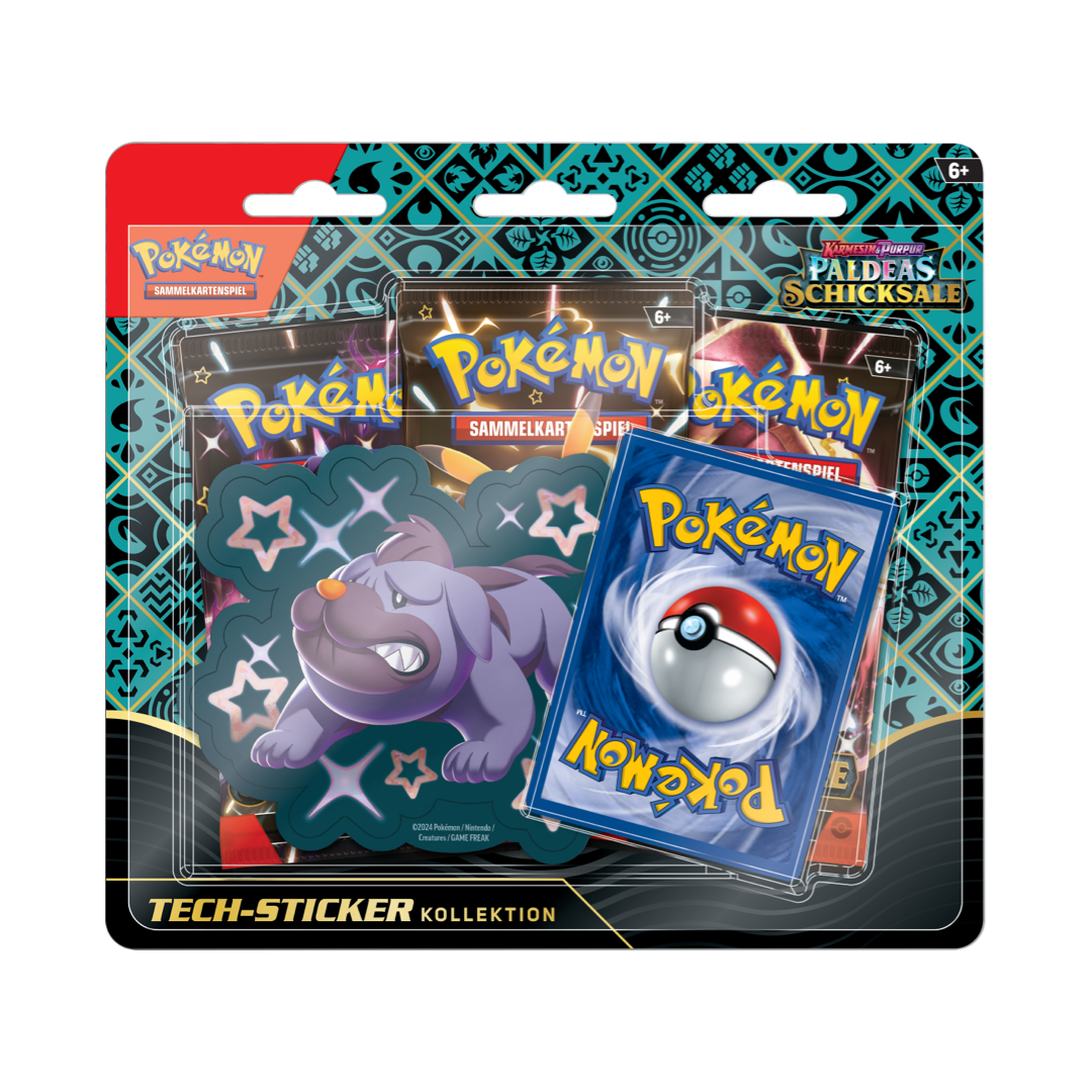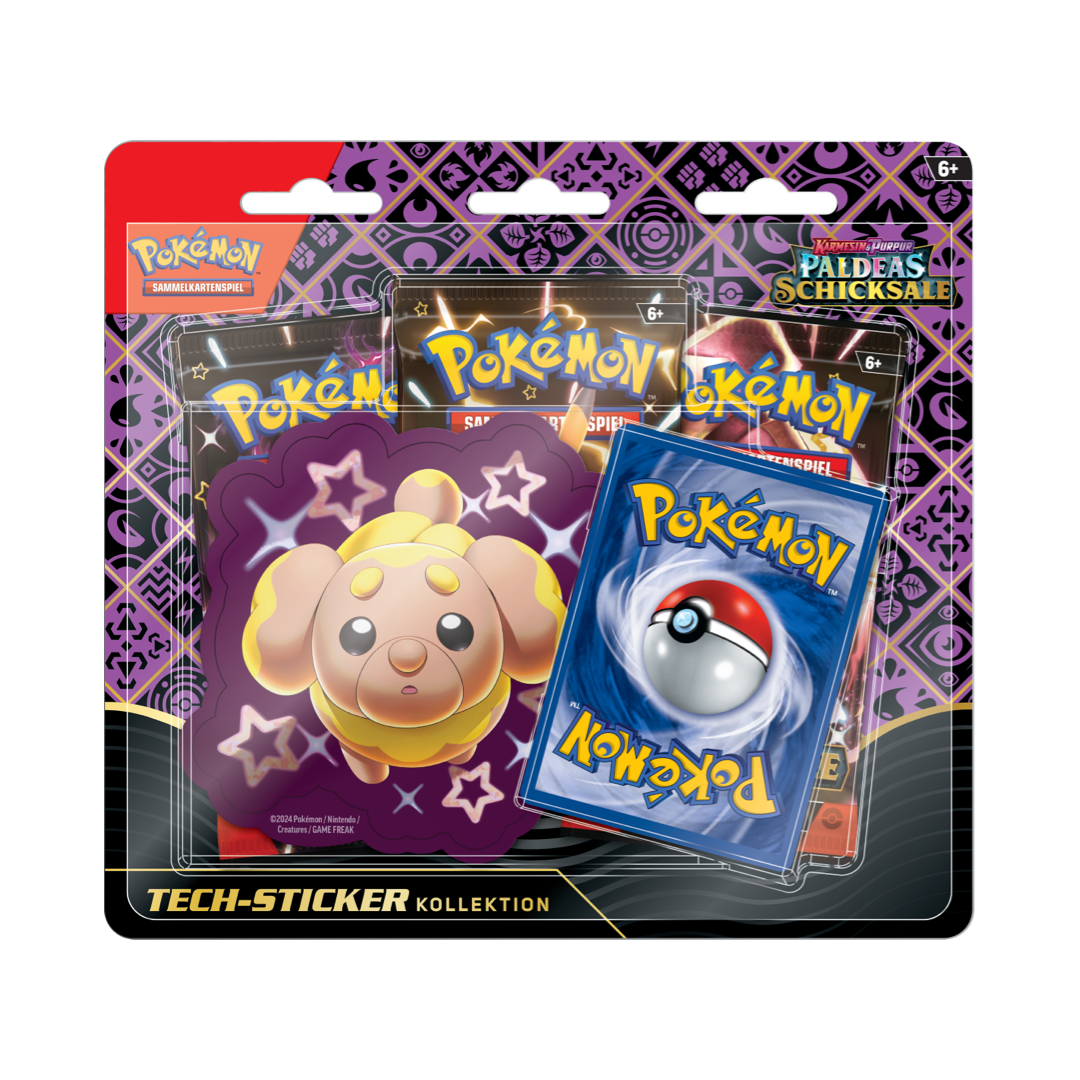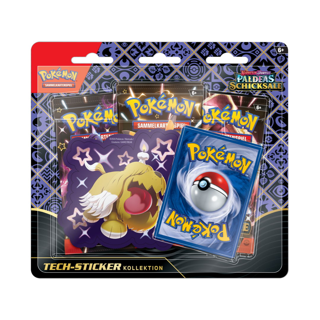 Die Tech-Sticker-Kollektion zur Erweiterung „Paldeas Schicksale“ enthält 3 Boosterpacks mit je 10 zufällig sortierten Karten, eine holografische Promokarte mit einem Schillernden Pokémon (Hefel, Mobtiff oder Gruff) sowie einen passenden Sticker, ideal zur individuellen Gestaltung von Laptop, Tablet oder Handy.