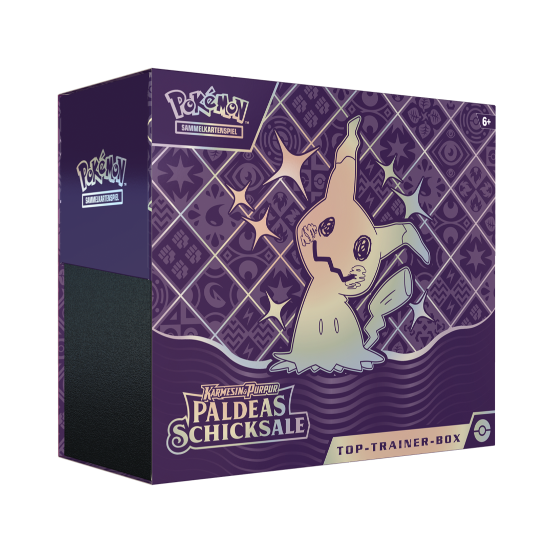 Die Top-Trainer-Box zur Erweiterung „Paldeas Schicksale“ enthält 9 Boosterpacks mit jeweils 10 zufällig sortierten Karten aus der Karmesin & Purpur-Serie. Zusätzlich liegt eine exklusive holografische Vollbild-Promokarte mit Schillerndem Mimigma bei.